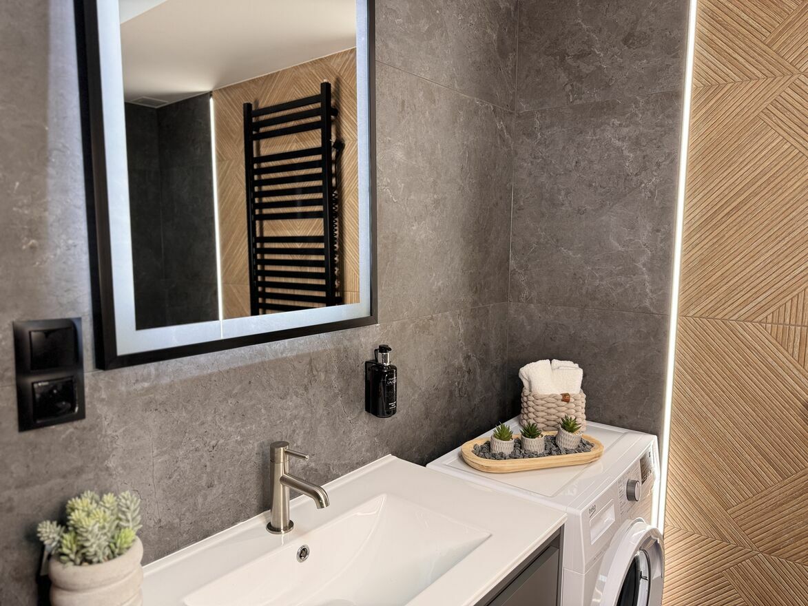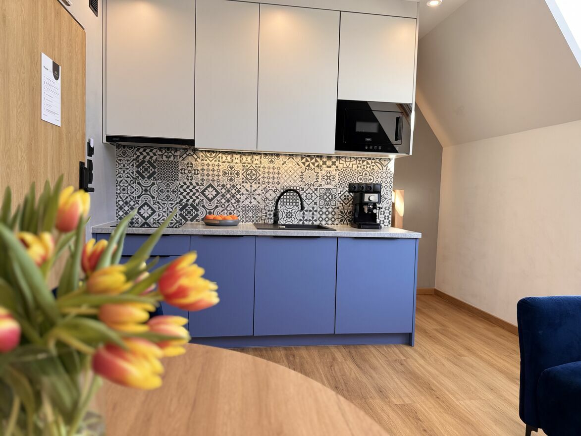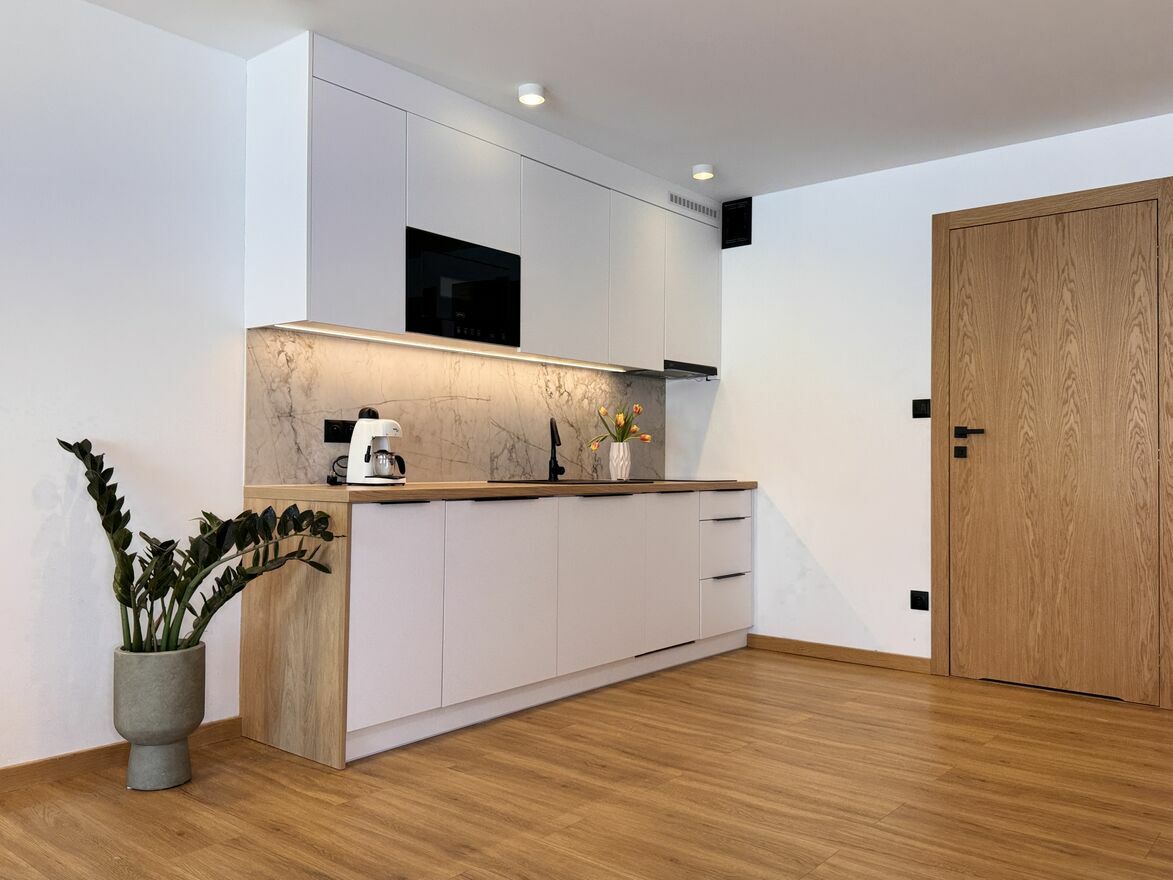 - apartament na parterze: 1 sypialnia, salon, otwarta kuchnia, łazienka