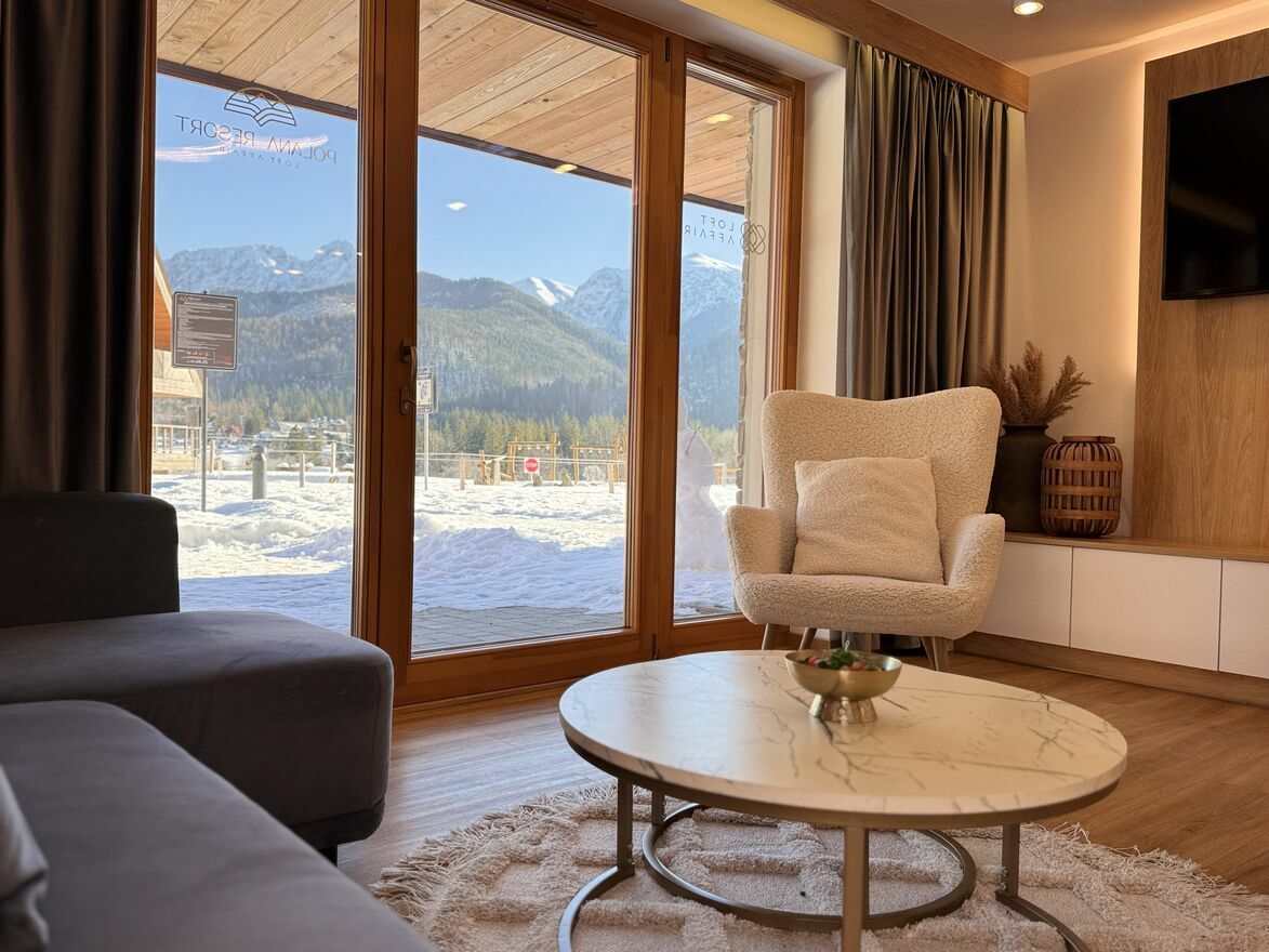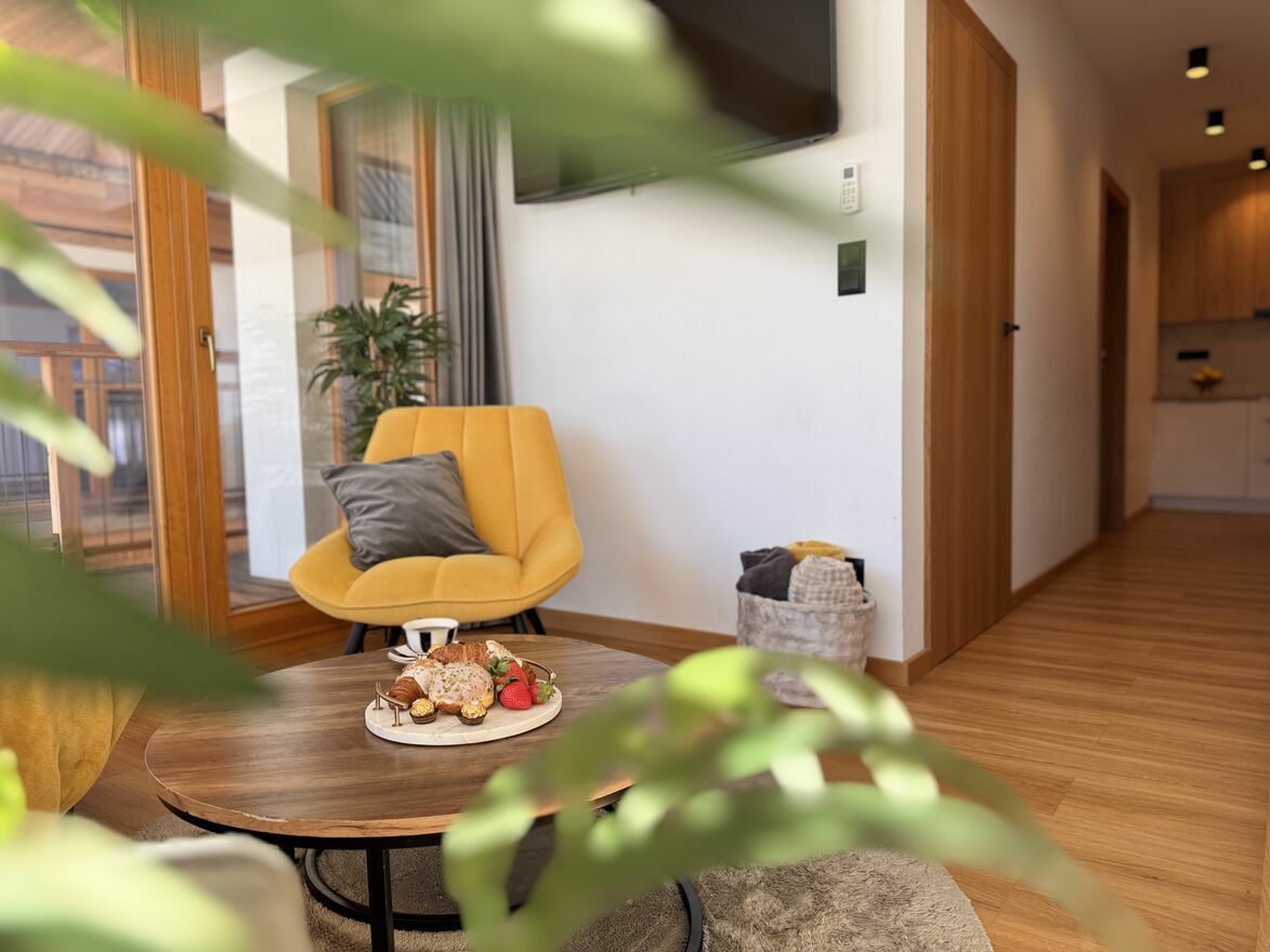 - apartament na 2 piętrze: 1 sypialnia, salon z kuchnią, łazienka, taras widokowy
