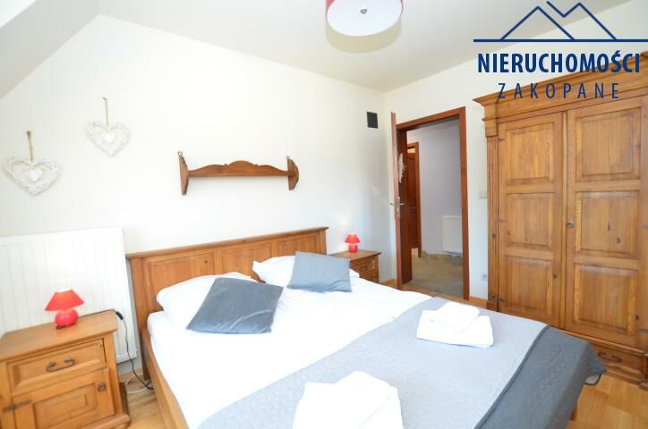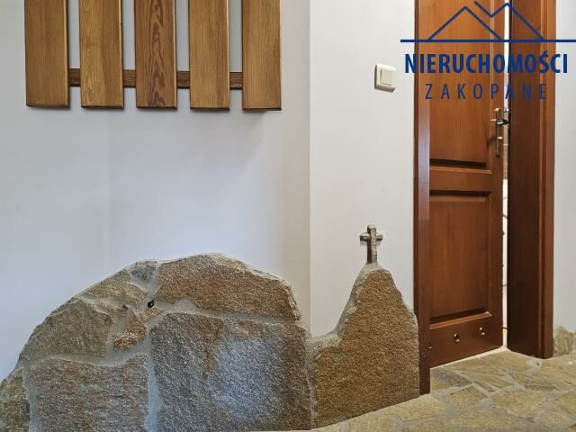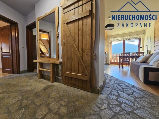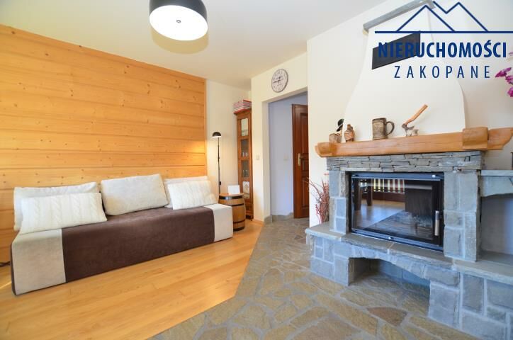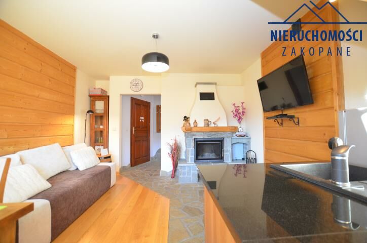 Apartament gotowy do zamieszkania urządzony w górskim klimacie - kominek, wykończenie w drewnie, podłoga z górskiego piaskowca.